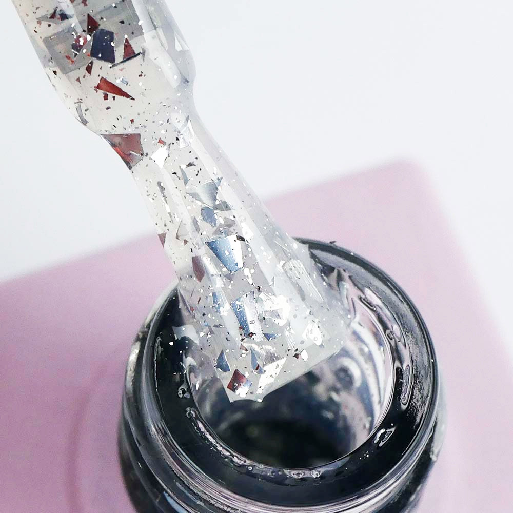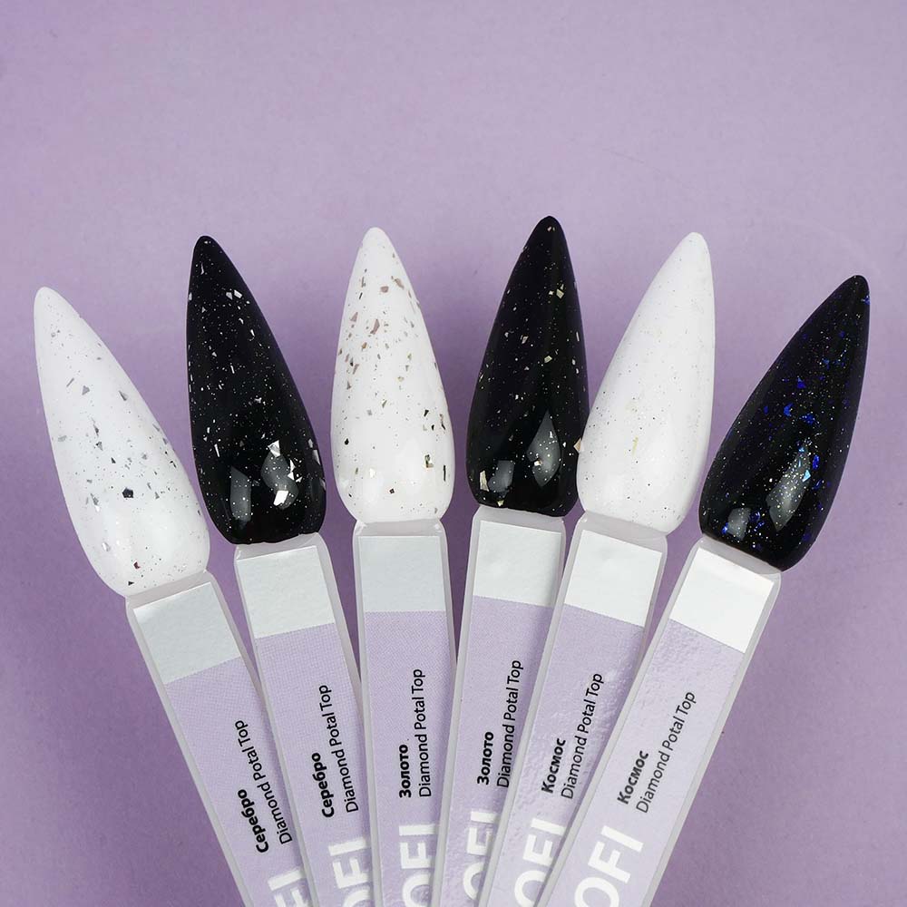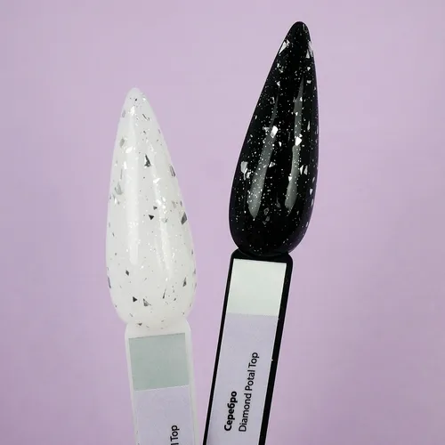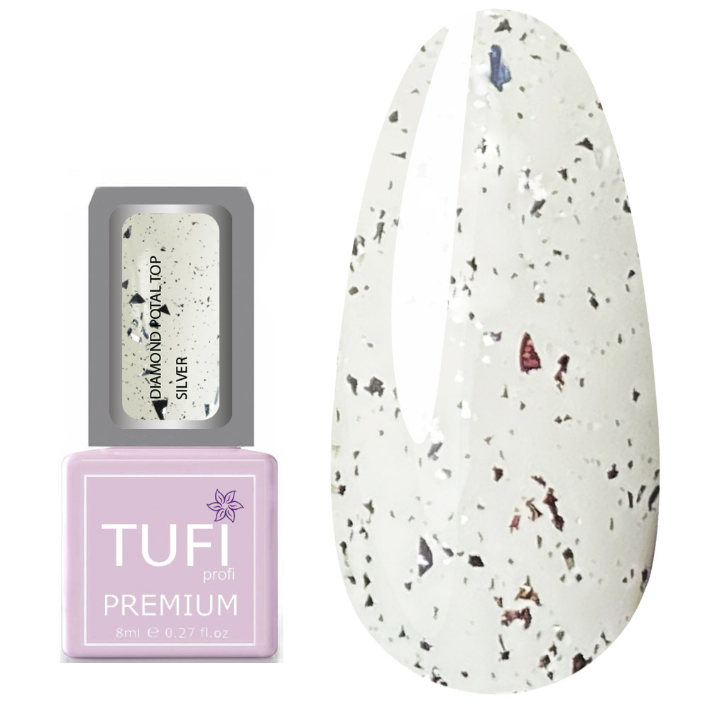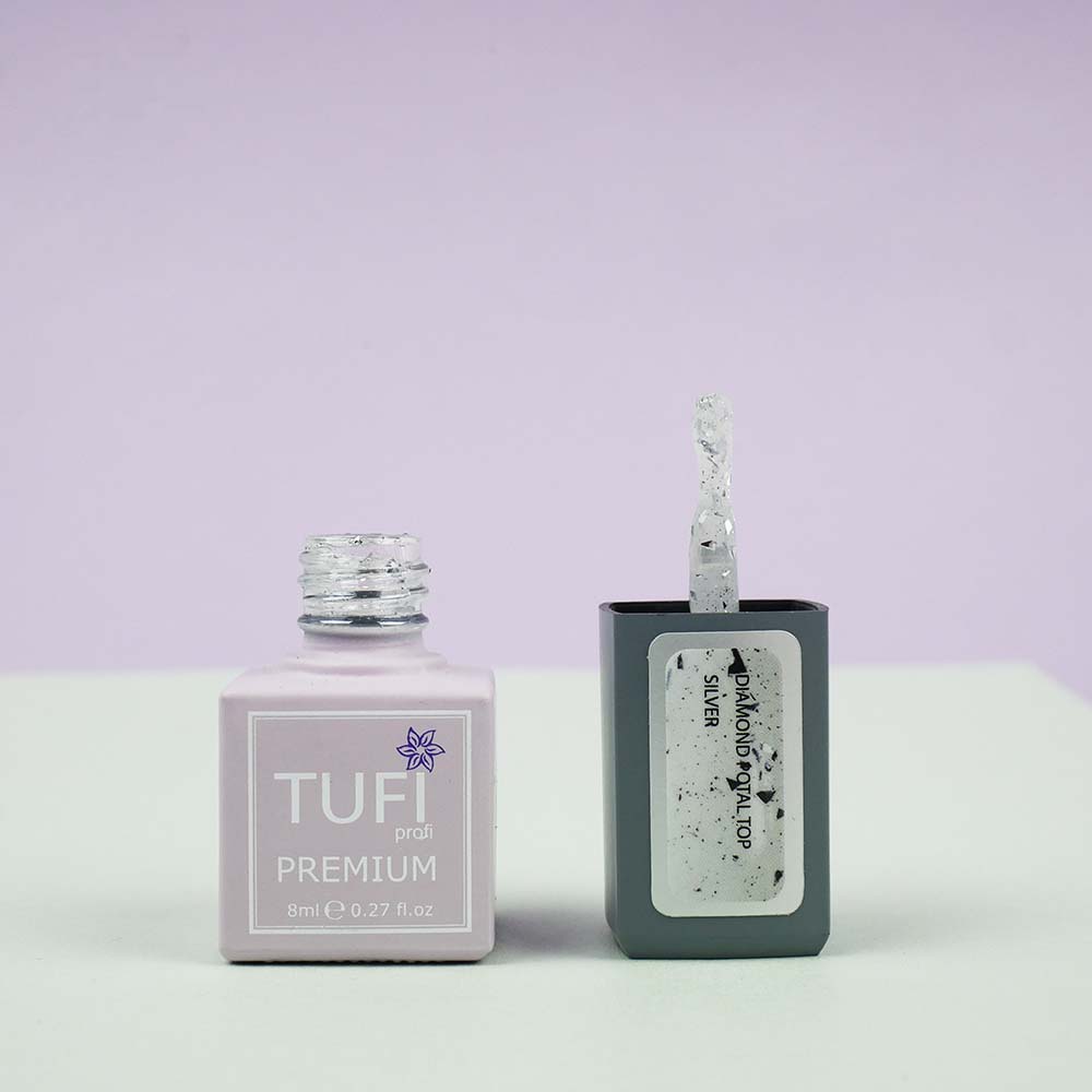 Top TUFI profi PREMIUM is an updated, improved, perfect top for gel polish, which creates a high-quality decorative coating on the natural nail plate. Diamond Potal Top contains silver potal pieces and shimmer. The top is easy to use, uniformly envelops the plate with a hard film. Top for gel polish has a thick consistency, will not flow onto the cuticle and side ridges. Top Tufi Profi has a durable coating, does not crack, provides application with ease and pleasure. The top does not have a sticky layer, so it does not require stickiness removal. The maximum amount of crumbs and shimmer, allows you to perfectly apply the top with crumbs from the first layer.