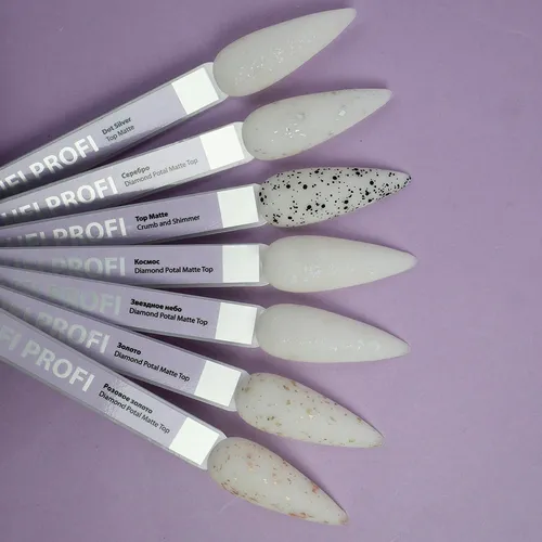 Top TUFI profi PREMIUM is an updated, improved, perfect top for gel polish, which creates a high-quality decorative coating on the natural nail plate. Diamond Potal Top contains potal pieces and shimmer. The top is easy to use, uniformly envelops the plate with a hard film. Top for gel polish has a thick consistency, will not flow onto the cuticle and side ridges. Top Tufi Profi has a durable coating, does not crack, provides application with ease and pleasure. The top does not have a sticky layer, so it does not require stickiness removal. The maximum amount of crumbs and shimmer, allows you to perfectly apply the top with crumbs from the first layer.