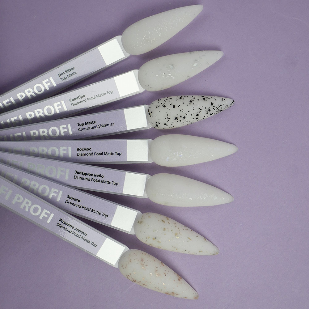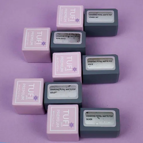 Top TUFI profi PREMIUM is an updated, improved, perfect top for gel polish, which creates a high-quality decorative coating on the natural nail plate. Diamond Potal Top contains potal pieces and shimmer. The top is easy to use, uniformly envelops the plate with a hard film. Top for gel polish has a thick consistency, will not flow onto the cuticle and side ridges. Top Tufi Profi has a durable coating, does not crack, provides application with ease and pleasure. The top does not have a sticky layer, so it does not require stickiness removal. The maximum amount of crumbs and shimmer, allows you to perfectly apply the top with crumbs from the first layer.