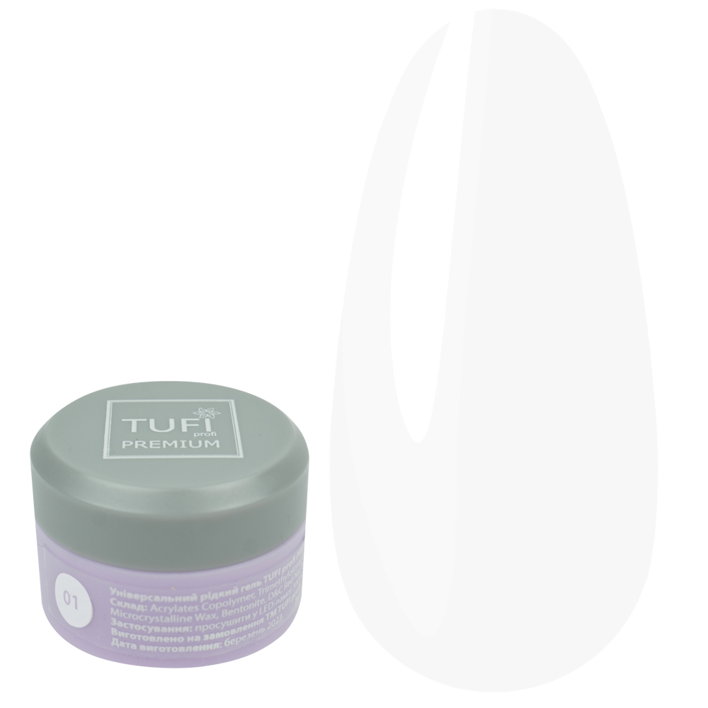 A collection of new generation liquid single-phase polygels is used to build and strengthen nails. The peculiarity of TUFI profi PREMIUM polygel is its strength and economical use. It is applied in a very thin and uniform layer, does not streak, and forms a solid polymer coating. It has a liquid consistency similar to a rubber base. It is very easy to apply - like a regular base, it practically does not require sawdust. Polymerization time in a UV/Ice lamp is 2-3 minutes.