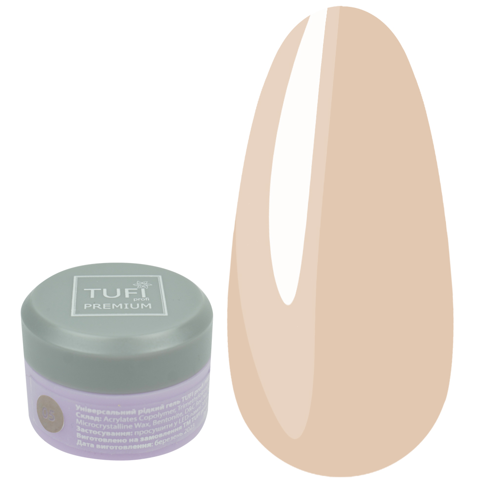 A collection of new generation liquid single-phase polygels is used to build and strengthen nails. The peculiarity of TUFI profi PREMIUM polygel is its strength and economical use. It is applied in a very thin and uniform layer, does not streak, and forms a solid polymer coating. It has a liquid consistency similar to a rubber base. It is very easy to apply - like a regular base, it practically does not require sawdust. Polymerization time in a UV/Ice lamp is 2-3 minutes.