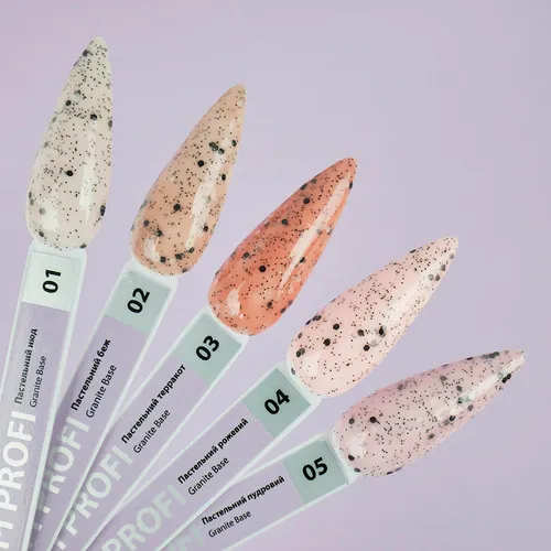 TUFI profi PREMIUM presents a new trendy line of color bases Granite Base. The base successfully performs the function of the main decorative coating and significantly speeds up the process of nail design. A feature of the base is that each color imitates the texture of granite stone. Inclusions have a variety of shapes and sizes, which makes the coating look like a real stone. With the new collection of bases, you can create an unsurpassed design with ease, since you do not need to use additional decor. Tufi pro base has a durable coating, does not crack, does not roll, provides application with ease and pleasure. Due to its dense consistency, the base easily fits on the nail, self-levels on the nail plate, and also strengthens it.