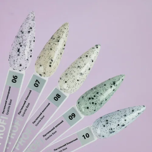 TUFI profi PREMIUM presents a new trendy line of color bases Granite Base. The base successfully performs the function of the main decorative coating and significantly speeds up the process of nail design. A feature of the base is that each color imitates the texture of granite stone. Inclusions have a variety of shapes and sizes, which makes the coating look like a real stone. With the new collection of bases, you can create an unsurpassed design with ease, since you do not need to use additional decor. Tufi pro base has a durable coating, does not crack, does not roll, provides application with ease and pleasure. Due to its dense consistency, the base easily fits on the nail, self-levels on the nail plate, and also strengthens it.