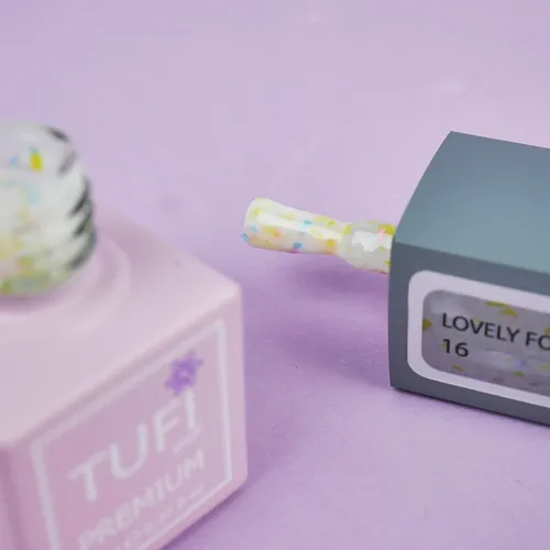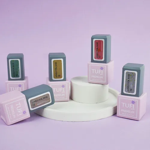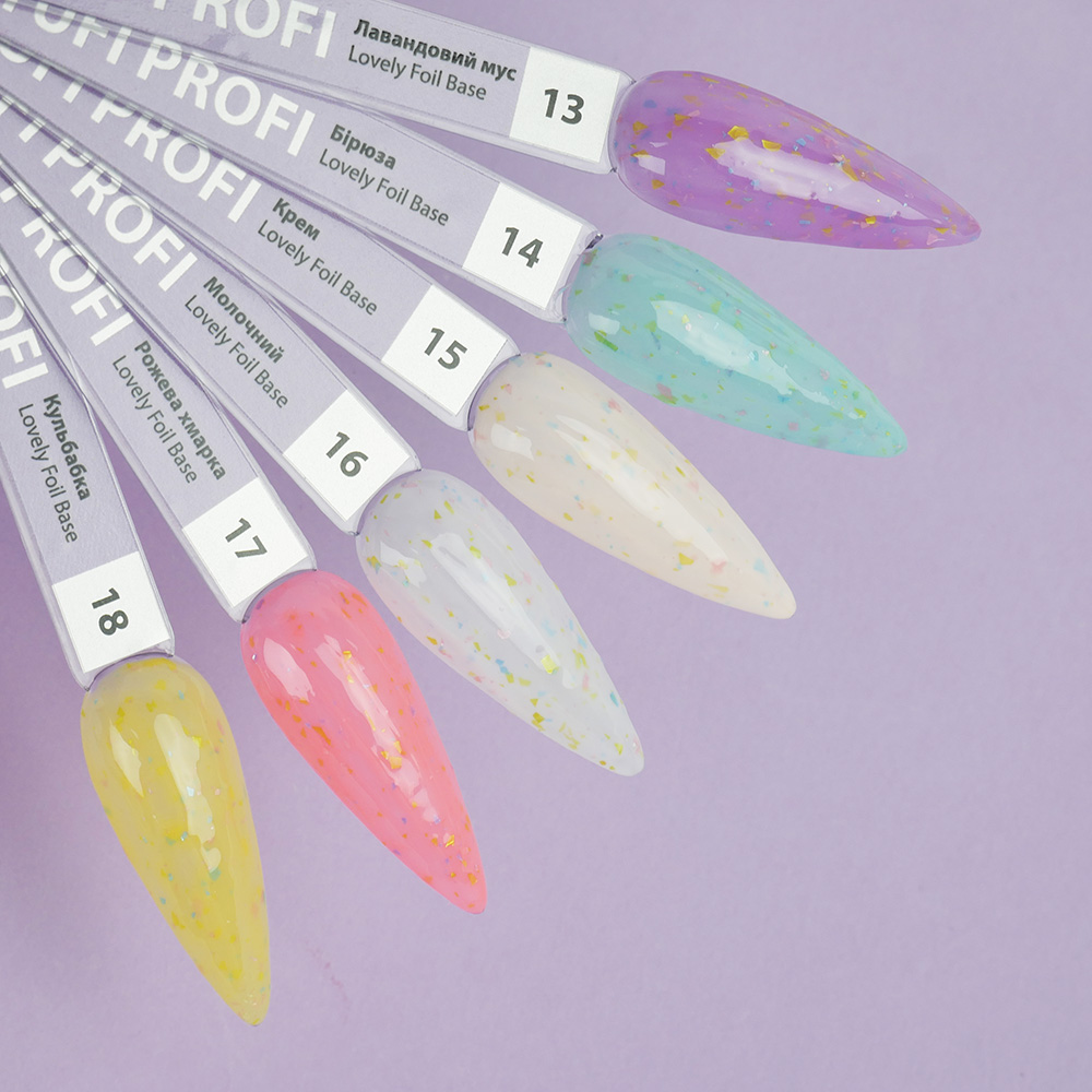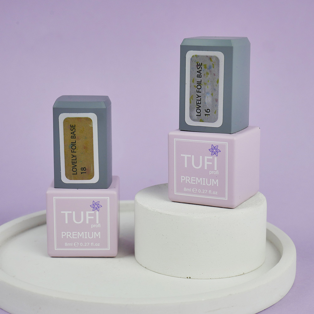TUFI profi Lovely Foil Base camouflaging rubber base with foil effect — a perfect combination of a delicate shade and refined shimmer that creates a unique, elegant design effortlessly. The foil particles are ultra-thin and not felt during application, keeping the coating smooth and comfortable.