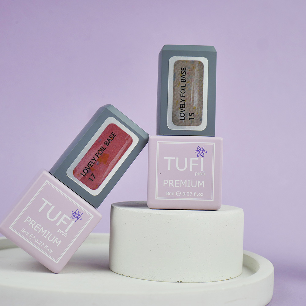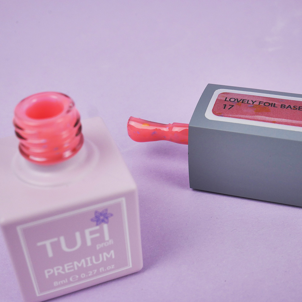 TUFI profi Lovely Foil Base camouflaging rubber base with foil effect — a perfect combination of a delicate shade and refined shimmer that creates a unique, elegant design effortlessly. The foil particles are ultra-thin and not felt during application, keeping the coating smooth and comfortable.