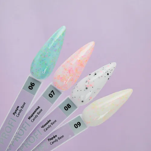 TUFI profi PREMIUM Candy Base is a base of pastel shades with multi-colored flakes that create a special airy effect. The palette is reminiscent of sweets that seem to teleport you to a walk through a bright fair as a child. A manicure in such a delicate shade will give you a feeling of joy and incredible emotions. With the new collection of bases, you can create an unsurpassed design with ease, since you do not need to use additional decor. Tufi profi base has a durable coating, does not crack, does not roll, provides application with ease and pleasure. Due to its dense consistency, the base easily fits on the nail, self-levels on the nail plate, and also strengthens it.
