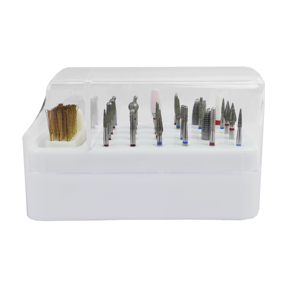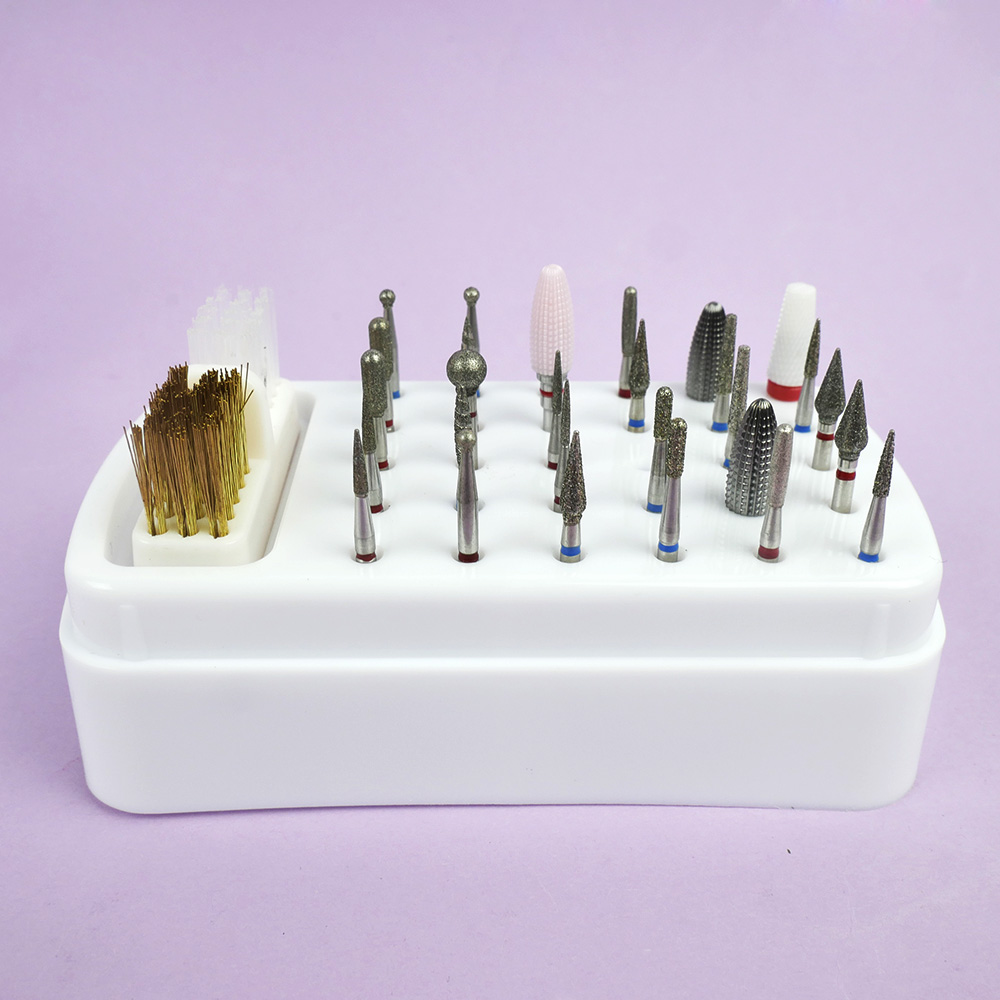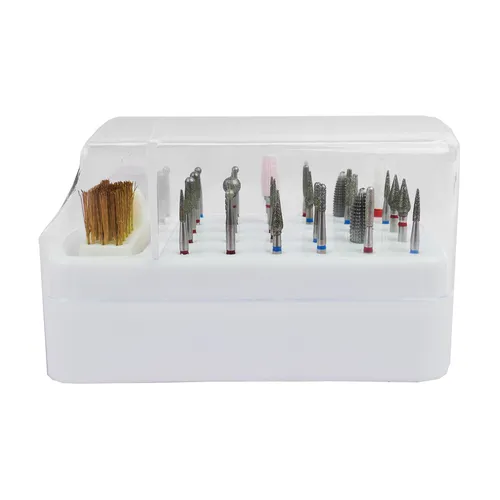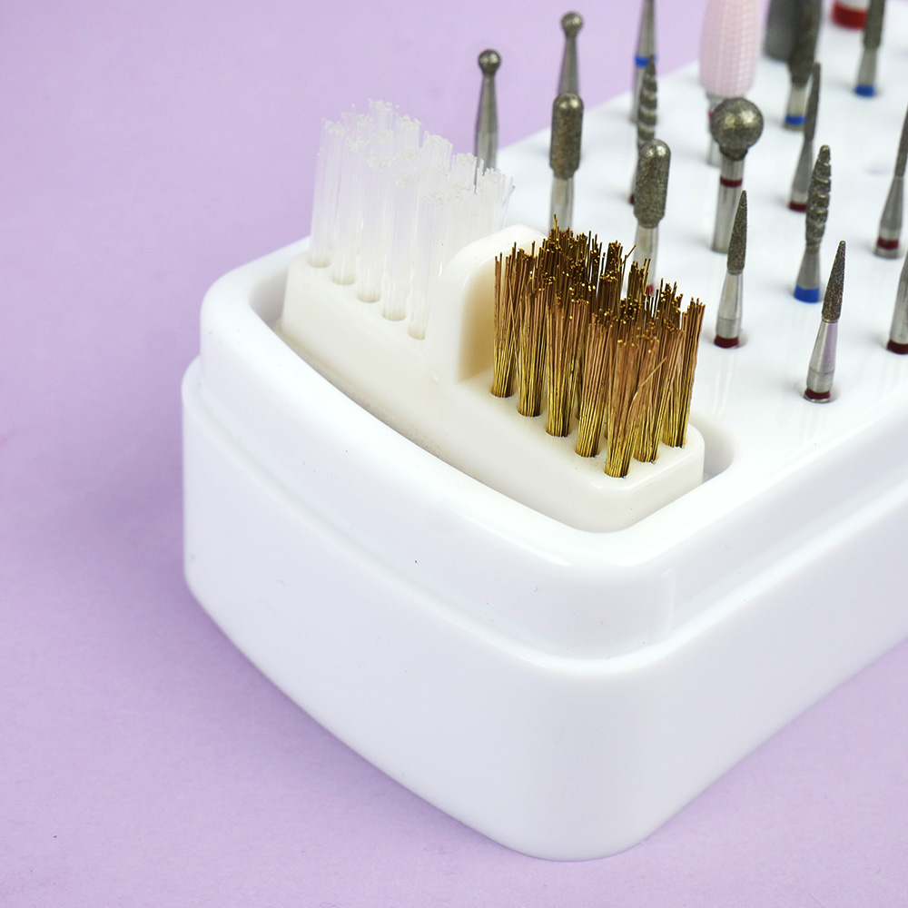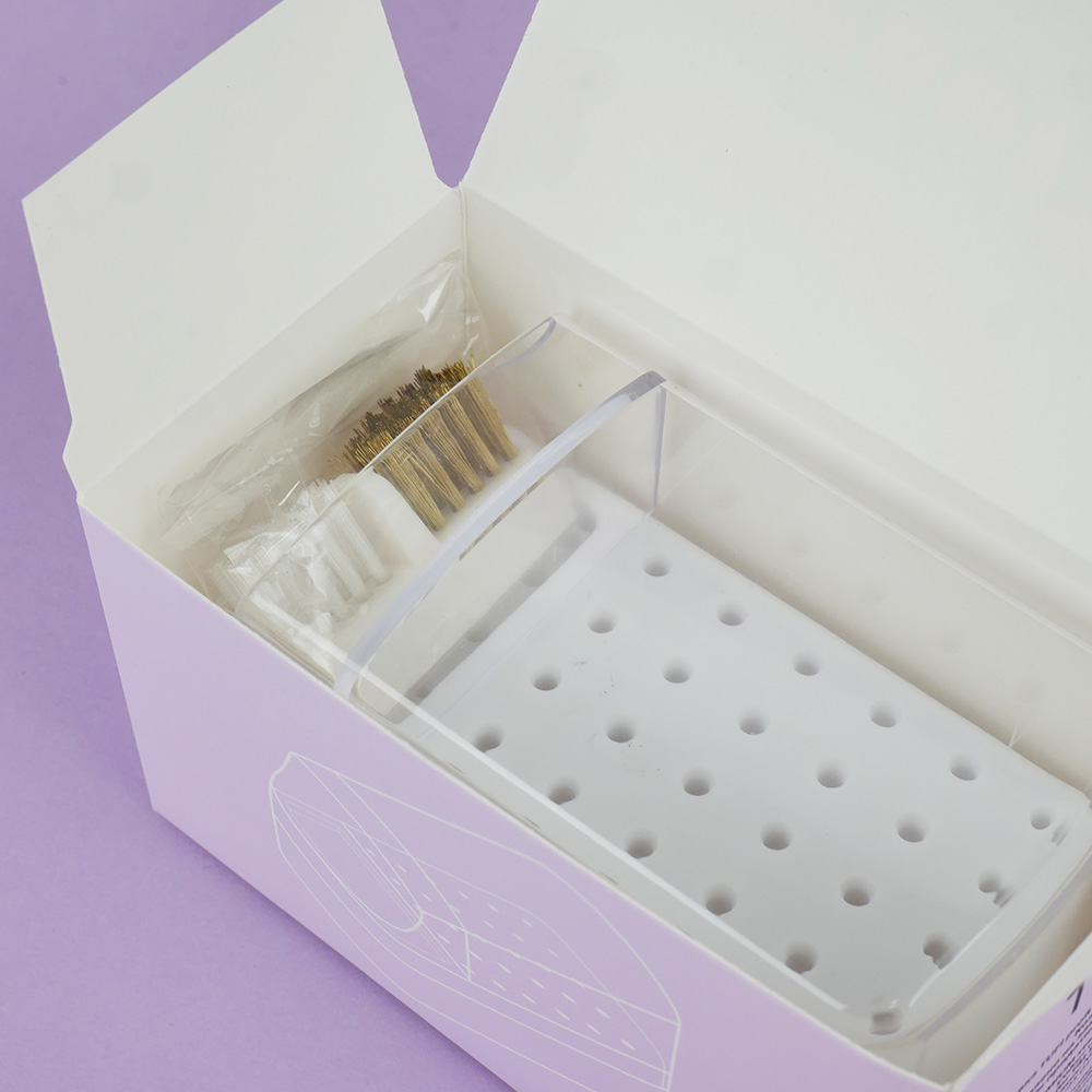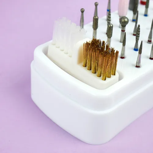 Modern manicure industry does not stand still and constantly surprises with new inventions, accessories and means of care for hands and nails. Today, most masters use a cutter, because it speeds up the work process. Especially for cutters are made a large number of attachments and caps, for proper and convenient storage and designed stand. The stand for cutters has 30 holes for cutters and a brush for cleaning cutters, also included in the set is a cover that protects from dust and loss of cutters. Having a stand will keep your desktop organized and allow quick access to any attachment. If you practice hardware procedures of manicure, pedicure, you will definitely appreciate the advantages of proper, convenient and compact storage of cutters. TUFI profi PREMIUM cutter cleaning brush is used for cleaning manicure instruments and cutters. The cutter cleaning brush has two working areas: the first with a metal pile and the second with a stiff bristle. Both sides make it easy to clean any surface of cutters from dust and material residues. For the most convenient work of a manicurist, this cutter cleaning brush is mounted on a flat surface.
