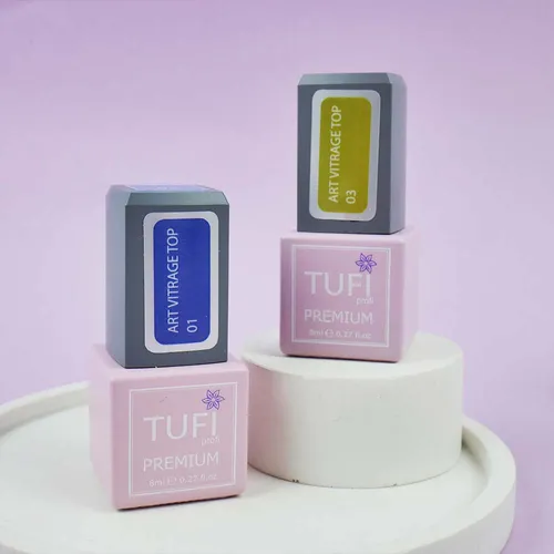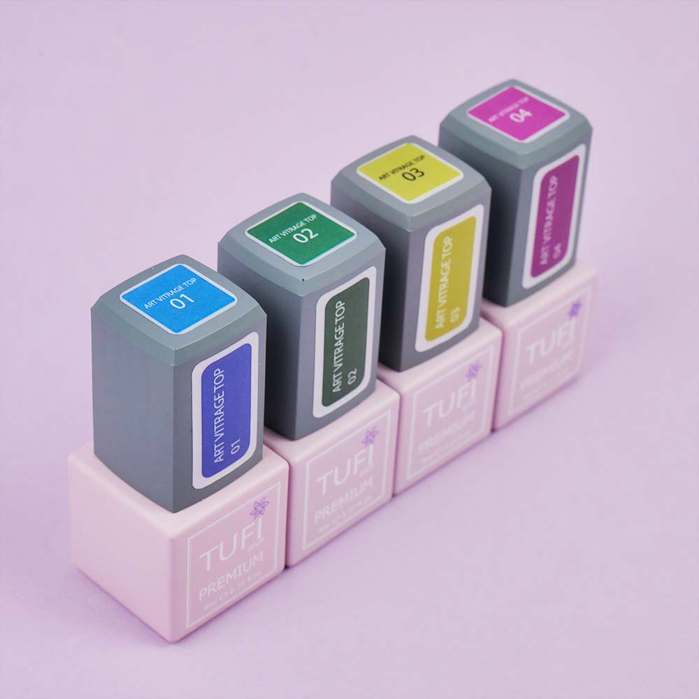 TUFI profi PREMIUM presents a new line of coloured tops ART VITRAGE TOP, which is the perfect choice for creating a stylish and flawless manicure. TUFI profi nail tops have a sophisticated stained glass effect that adds depth and an unsurpassed look to the manicure, resembling coloured glass. The TUFI profi stained glass top gives you not only a chic look, but also durability and longevity, maintaining colour saturation and shine for up to 3 weeks without fading or flaking. This top does not have a sticky layer, so it does not need to be removed, making it convenient to use. It has the right consistency for easy application and self-leveling. The TUFI profi top does not crack or roll off, strengthening the nails, which is ideal for beginners. It significantly reduces manicure time, creating beautiful and strong nails.