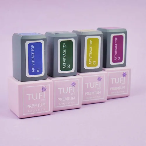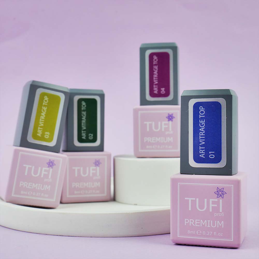 TUFI profi PREMIUM presents a new line of coloured tops ART VITRAGE TOP, which is the perfect choice for creating a stylish and flawless manicure. TUFI profi nail tops have a sophisticated stained glass effect that adds depth and an unsurpassed look to the manicure, resembling coloured glass. The TUFI profi stained glass top gives you not only a chic look, but also durability and longevity, maintaining colour saturation and shine for up to 3 weeks without fading or flaking. This top does not have a sticky layer, so it does not need to be removed, making it convenient to use. It has the right consistency for easy application and self-leveling. The TUFI profi top does not crack or roll off, strengthening the nails, which is ideal for beginners. It significantly reduces manicure time, creating beautiful and strong nails.