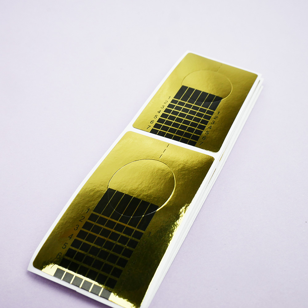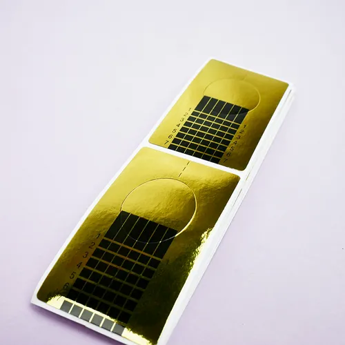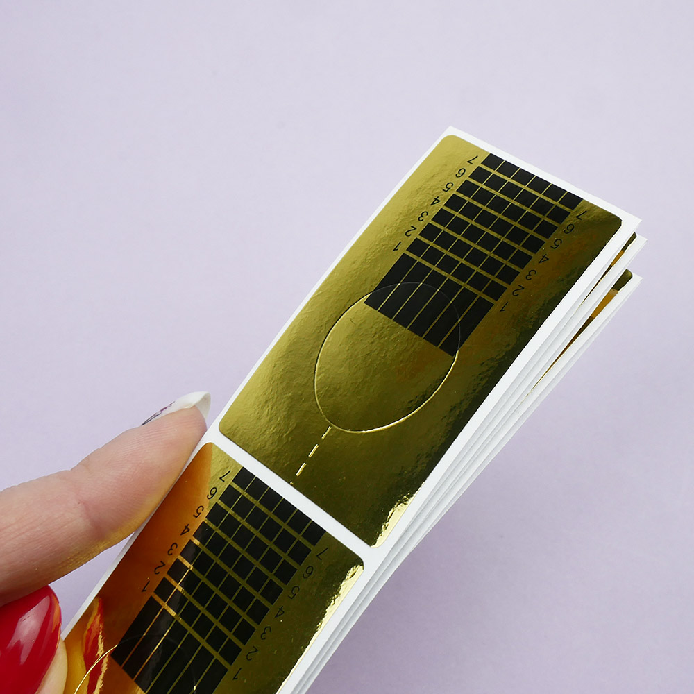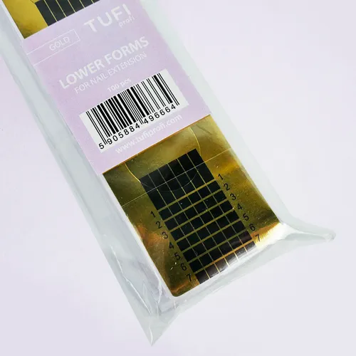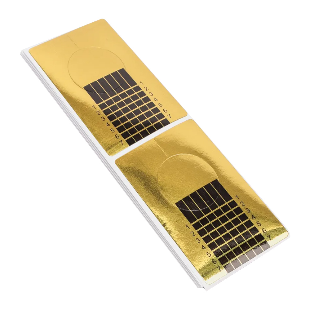 TUFI profi PREMIUM Nail Extension Forms – an essential tool in nail services, used for creating artificial manicures with the help of builder gels. These nail extension forms fit any nail shape, allowing for the creation of a neat nail plate. Extension using forms ensures both the correct shape and desired length of the nail. The forms are made of sticky, durable paper, ensuring secure application. They are printed with guide lines that help measure the length of the extended nail. The form is easy to use and removes cleanly without leaving residue.