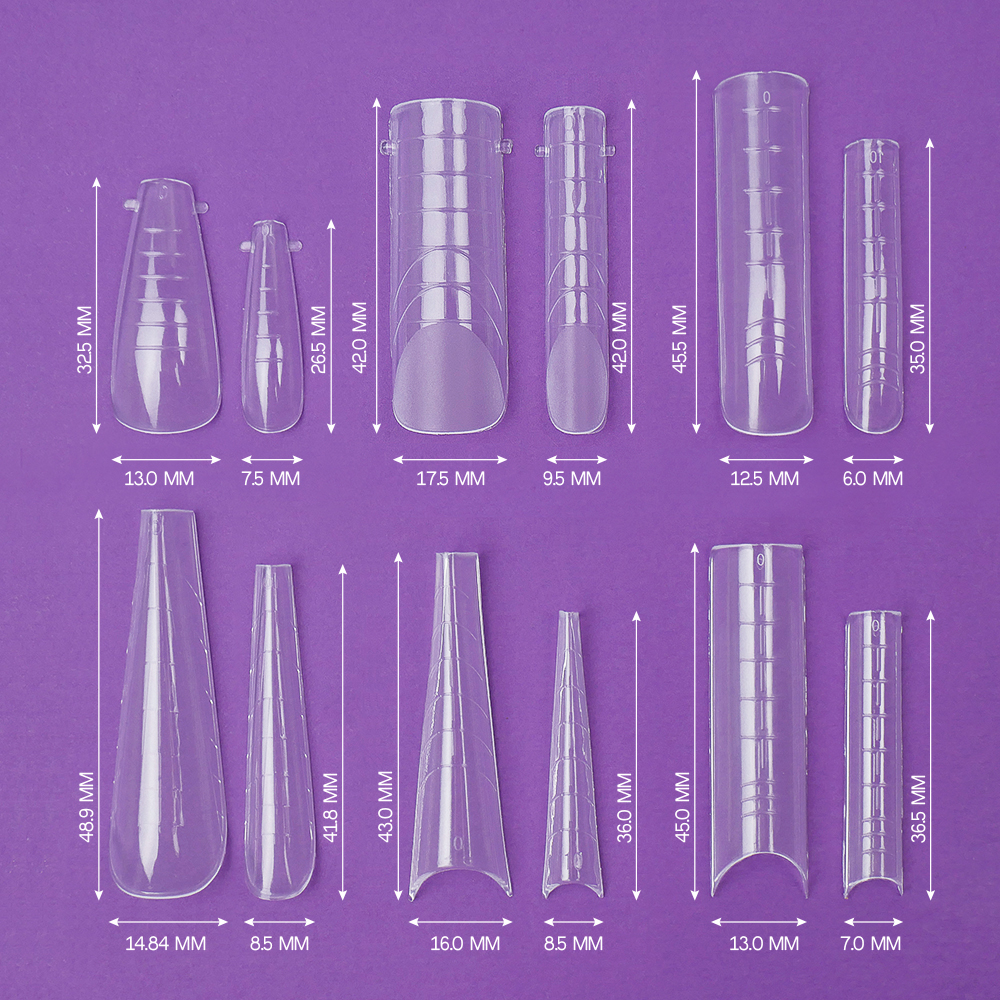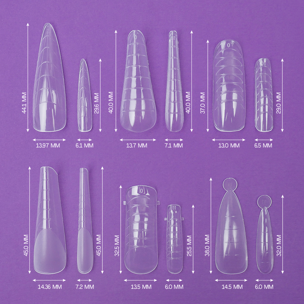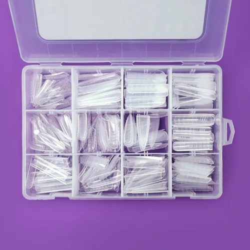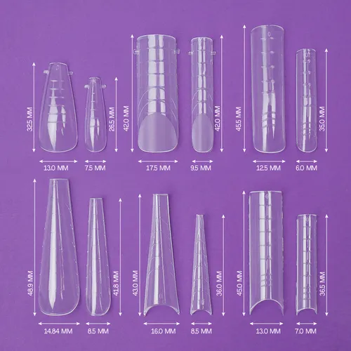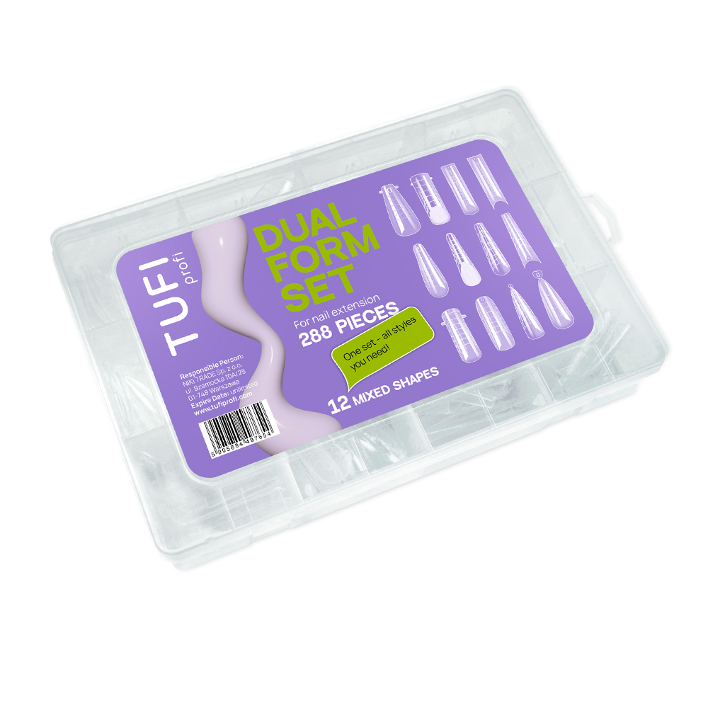 Professional reusable dual forms TUFI Profi are designed for nail technicians who value speed, flawless architecture, and premium results. The package contains 12 types of forms, 24 pcs of each size — allowing you to choose the most suitable shape based on the natural nail bed. The set includes classic shapes — almond, square, ballerina, as well as more complex ones — pipe, stiletto, which makes it possible to meet almost any client request. The forms are made of transparent, flexible, and durable plastic that perfectly adapts to the nail plate and ensures the correct curve, ideal apex, and natural thinness with minimal filing. Built-in guidelines help create even, symmetrical nails and a predictable result at every stage of modeling.