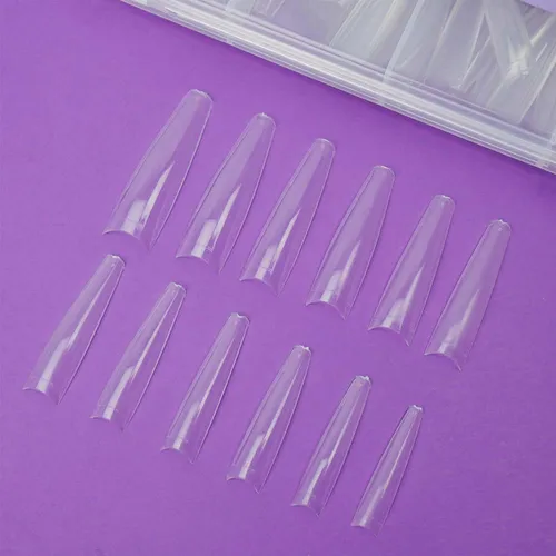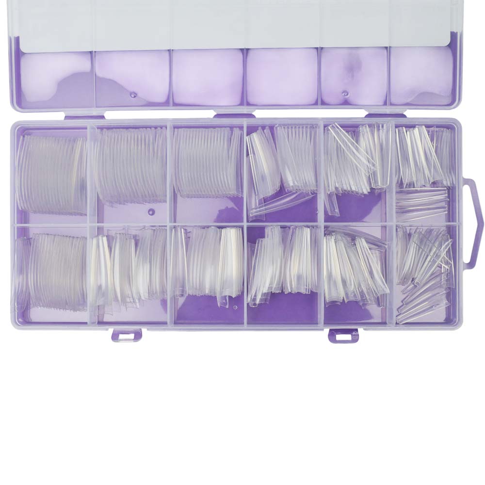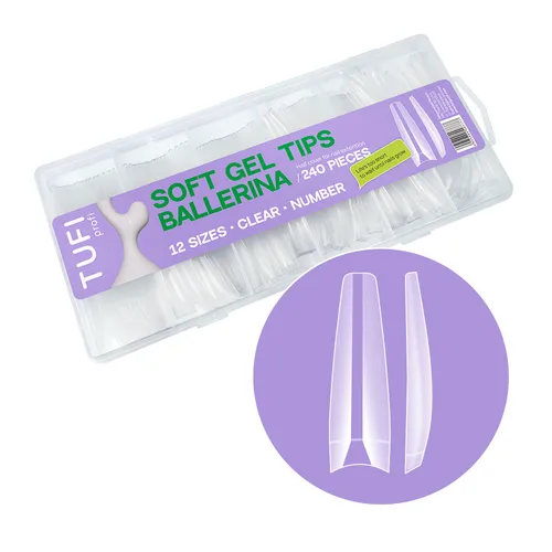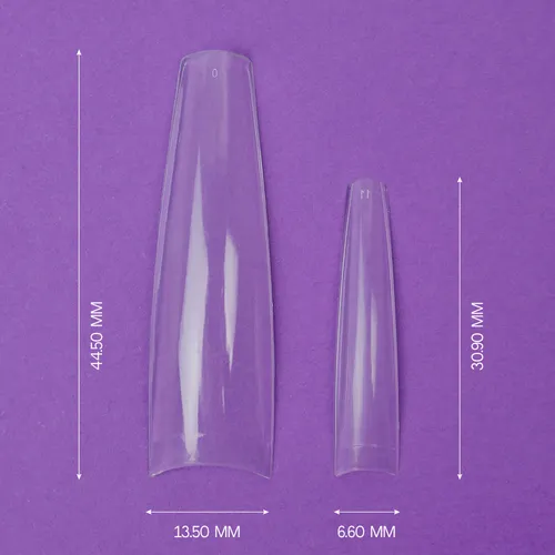 Each set contains 240 transparent tips in 12 sizes (0–11), which allows finding the perfect match for any nail type. They are easily removed either by filing or soaking off. Compatible with all LED/UV lamps and gel bases. The range includes three main shapes of half-cover gel tips: ballerina, stiletto, and square — for complete creative freedom in building any length and shape to suit any style and client request.
