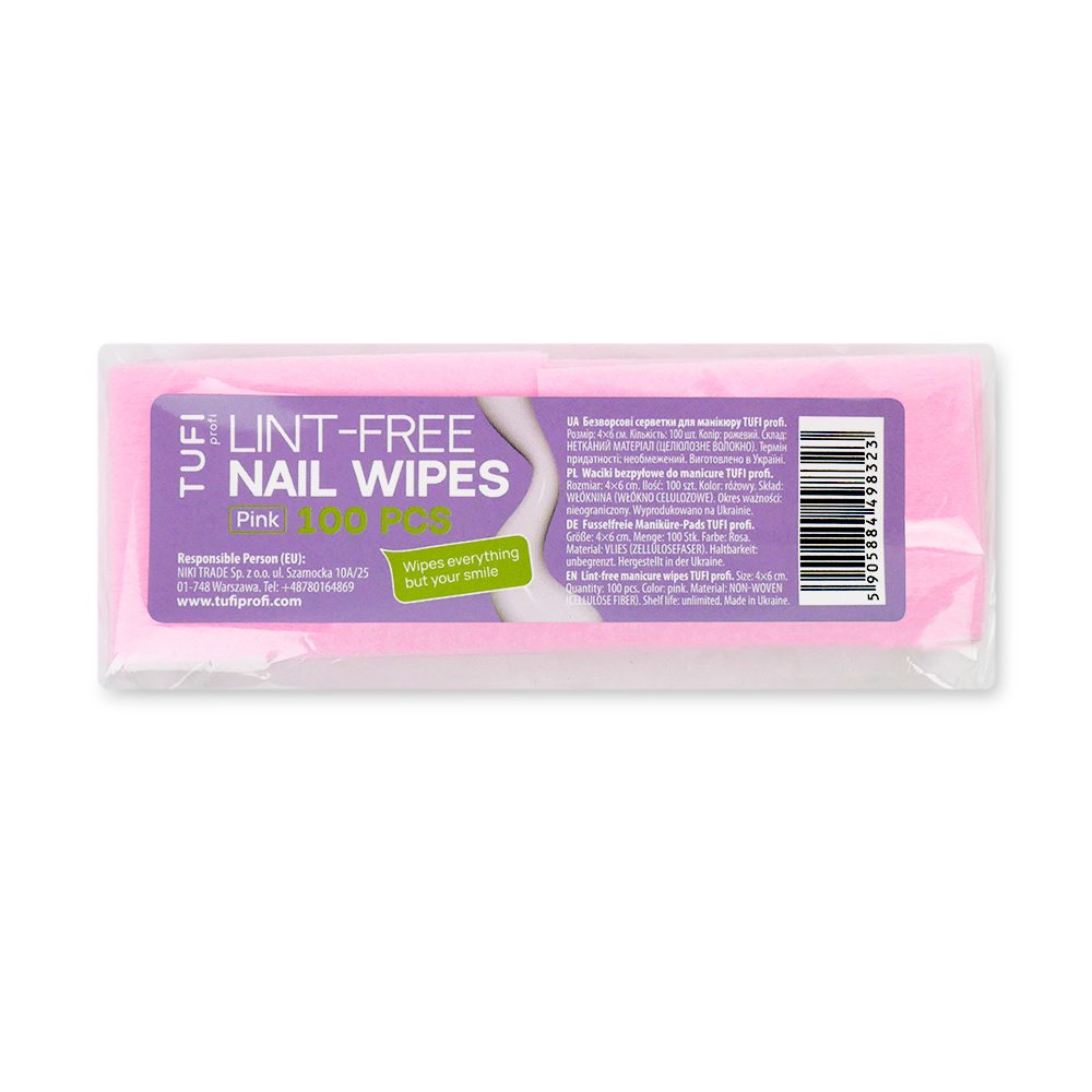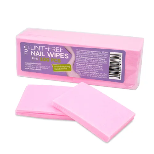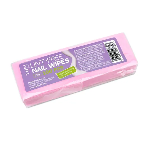 TUFI profi Lint-Free Wipes Pink 4×6 cm 100 pcs — an essential consumable for everyday work of nail technicians, designed for precise and safe preparation of the nail plate. The wipes are made of dense high-quality material that does not leave lint, fibers, or dust on the nail surface. They do not delaminate or tear during use, which is especially important when degreasing, removing the sticky layer, and cleaning the nail plate. The material absorbs liquid well, does not deform when in contact with cleanser, dehydrator, or other professional liquids, and provides a clean result without unnecessary movements.