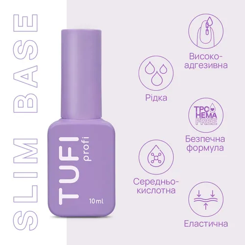 TUFI PROFI SLIM BASE is a transparent liquid adhesive base designed to provide maximum adhesion to the natural nail without adding extra thickness to the coating. It is a thin bonding base that works as a reliable foundation for gel polish, hard materials, and color bases in cases where standard bases are not sufficient. The base is applied in an ultra-thin rubbing layer and ensures stable adhesion even on challenging nails — thin, moist, and prone to lifting. SLIM BASE is not intended for leveling and does not create excess thickness, preserving the most natural look of the coating. It has proven especially effective in pedicure services and when working with clients who have increased nail plate moisture.