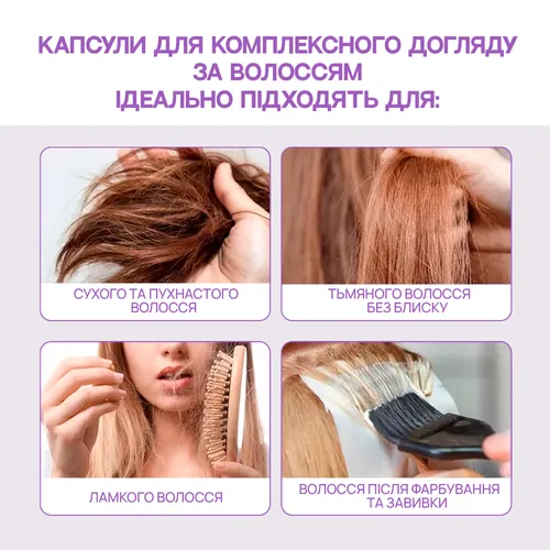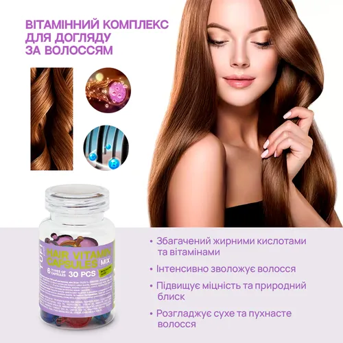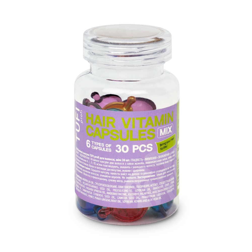 TUFI profi Hair Vitamin Capsules Mix are vitamin capsules designed for intensive hair care, restoration, and shine. This professional complex is developed for deep nourishment and protection of all hair types. The concentrated formula based on valuable oils and vitamins instantly improves the appearance of the hair, making it smoother, softer, and more manageable. Each capsule contains a leave-in oil enriched with vitamins A, C, E, provitamin B5, Moroccan oil, jojoba oil, and aloe vera extract. Active ingredients provide comprehensive hair care, help restore the hair structure, and protect it from negative environmental effects. The individual capsule format preserves the maximum effectiveness of active ingredients and ensures convenient dosing during each use.
