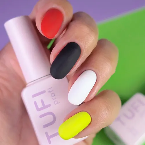 TUFI profi Soft Touch Matte Top makes shades deeper and more expressive — from nude to rich dark tones. Even a simple solid-color coating looks stylish and neat. The formula is designed so that the matte effect remains even throughout the entire wear period: the coating does not rub off, does not polish to gloss, and keeps the manicure looking neat. The surface of the top coat is less prone to excessive staining, so the matte finish stays clean and well-groomed even during long wear. The balanced consistency ensures comfortable work: the top spreads easily over the nail plate, perfectly self-levels, and evenly covers the surface without streaks or uncovered areas. The coating does not slide during application and allows precise work even close to the cuticle. After polymerization, the top forms a smooth velvety matte surface without unwanted glossy areas with a soft-touch effect. The formula has a neutral odor and does not cause strong heating of the nail plate during curing, ensuring comfortable work for the nail technician. UV filters in the formula help prevent yellowing of light shades and maintain color purity. Suitable for professional salon use as well as for home manicure.