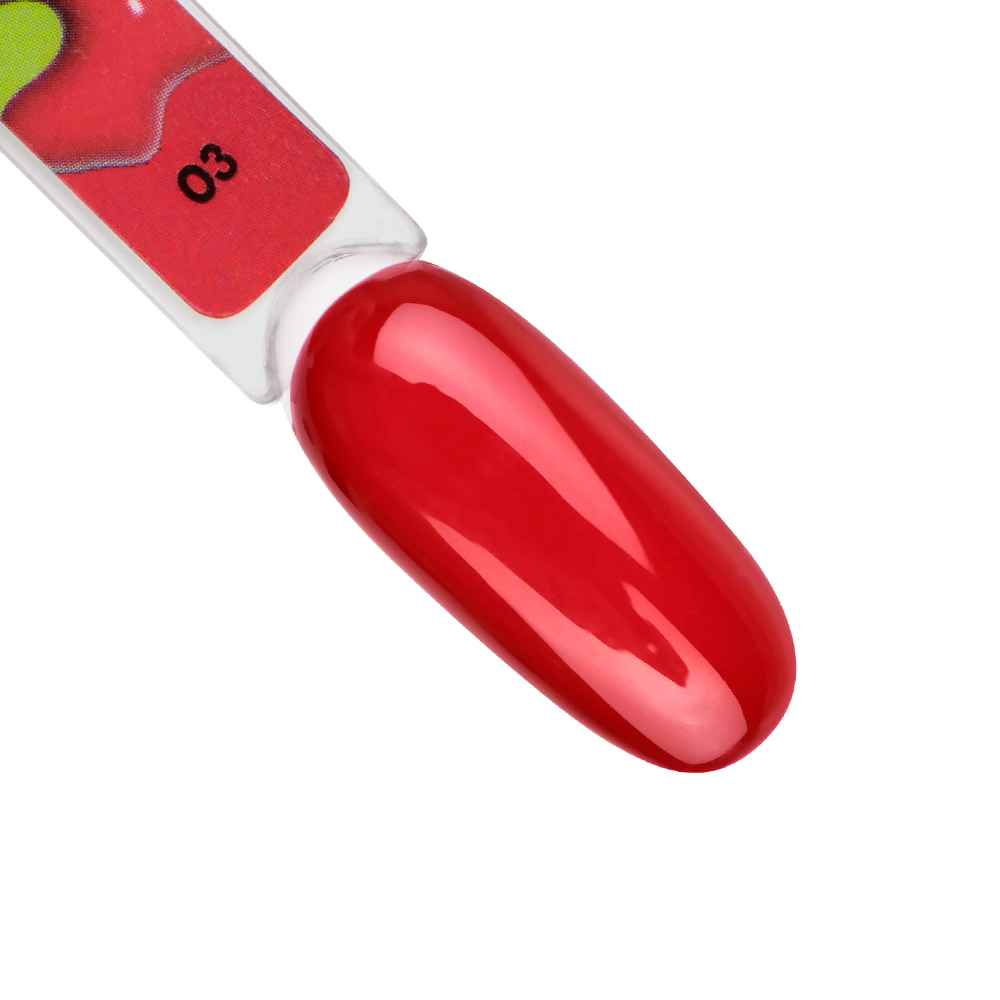 NEW PURE FORMULA — a modern formula free from TPO and HEMA, developed according to current safety standards for both nail technicians and clients. REDLINE 03 Core is a rich bright red shade without dark undertones. The color looks juicy, fresh, and expressive, beautifully enhancing a manicure on nails of any length. Thanks to its high pigmentation, the gel polish fully covers the nail plate in just one coat, while two thin coats can be applied for a deeper and more intense color.