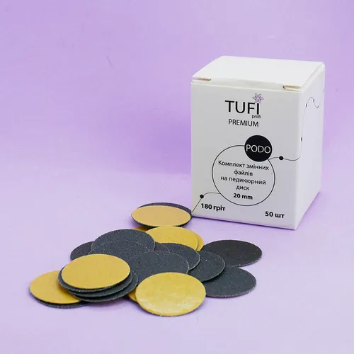 Replaceable files for the TUFI profi pedicure disc are designed for pedicure in salons. Replaceable Tufi Profi files are disposable with an abrasive surface. They are specially designed for hygiene safety. Replaceable TUFI profi files are glued to a round metal base and removed after the procedure. The TUFI profi pedicure disc is certainly the ideal metal base for such removable files. The metal base must be sterilized and disinfected after each client. The set consists of 50 stickers with 180 grit. The files are durable, waterproof and suitable for rough skin.