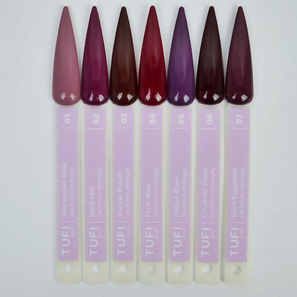 TUFI profi Midnight professional pigmented gel polish combines rich color, a smooth consistency, and long-lasting wear. With its high pigmentation, it provides full coverage in just 1–2 coats. This evening collection of gel polishes comes in stylish lavender bottles and features 20 deep, intense shades — from soft lavender to mysterious black. These colors are designed for those who want to express their mood and turn heads.