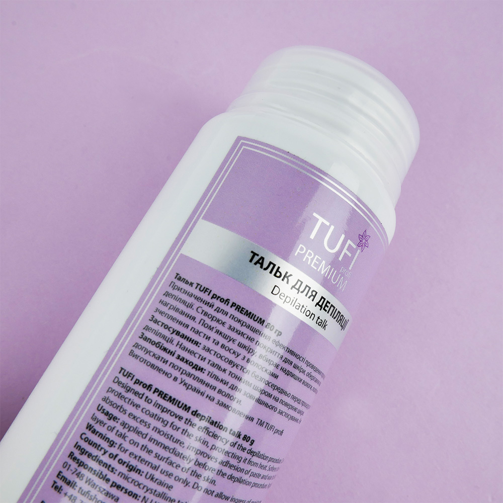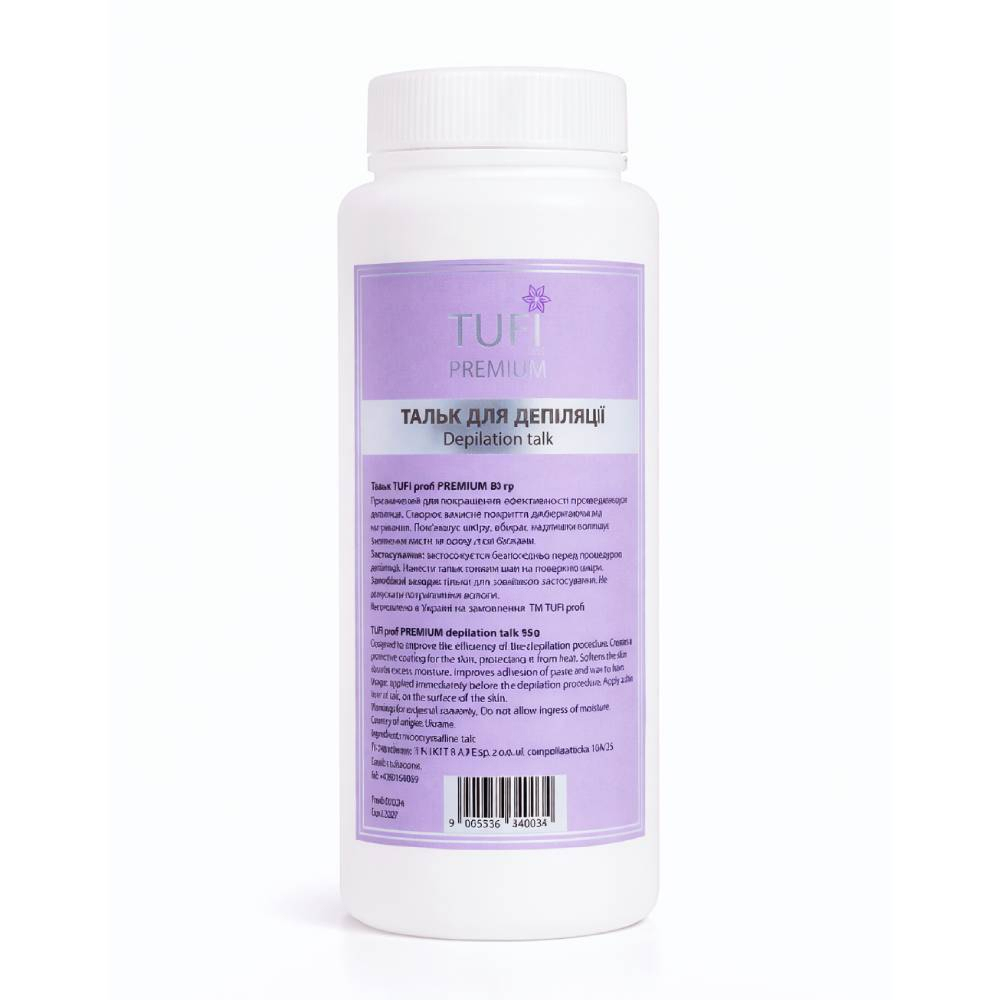 Women's beauty is simply unthinkable without smooth and silky skin, therefore, it is not surprising that a huge number of girls practice all possible methods to remove unwanted hair. One of the most popular hair removal methods is depilation. Talc TUFI profi PREMIUM is designed to increase the effectiveness of the depilation procedure. To prepare the skin before shugaring, laser or wax depilation, talc is used. The purpose of this product is to soften the skin, absorb excess moisture, and effectively adhere the paste to the hairs in order to easily remove the hairs from the skin.