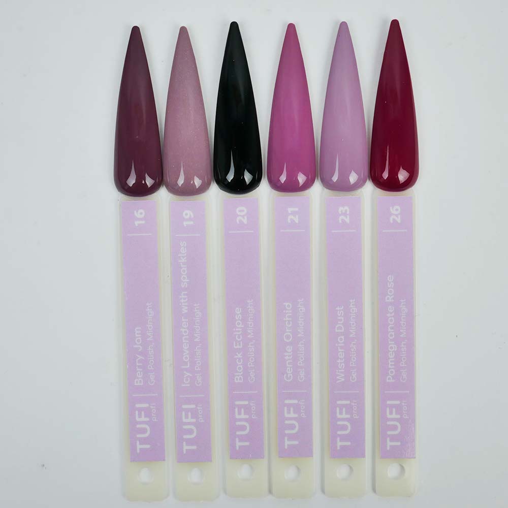TUFI profi Midnight professional pigmented gel polish combines rich color, a smooth consistency, and long-lasting wear. With its high pigmentation, it provides full coverage in just 1–2 coats. This evening collection of gel polishes comes in stylish lavender bottles and features 20 deep, intense shades — from soft lavender to mysterious black. These colors are designed for those who want to express their mood and turn heads.