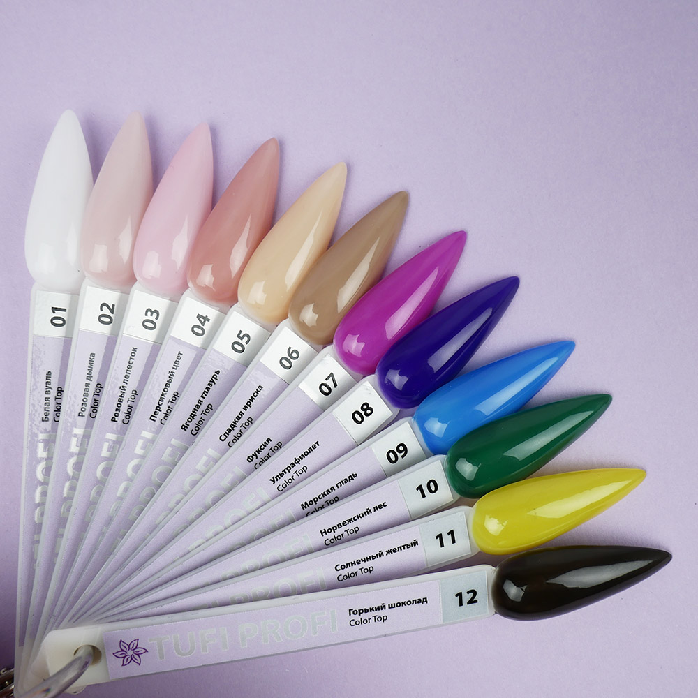 TUFI profi PREMIUM presents a new trend line of Color Tops. Bright, bold and tasteful! Any manicure will be unsurpassed with the TUFI profi colored top. This nail top is very easy to use. It has a durable coating, does not crack, does not roll, provides application with ease and pleasure. The top does not have a sticky layer, so it does not require stickiness removal. Due to the correct consistency, the top coat is easy to lay down on the nail, self-leveling on the nail plate, and also strengthens it. The product is very easy to use for beginners. Color tops TUFI profi will significantly reduce the time of work for each nail-master!