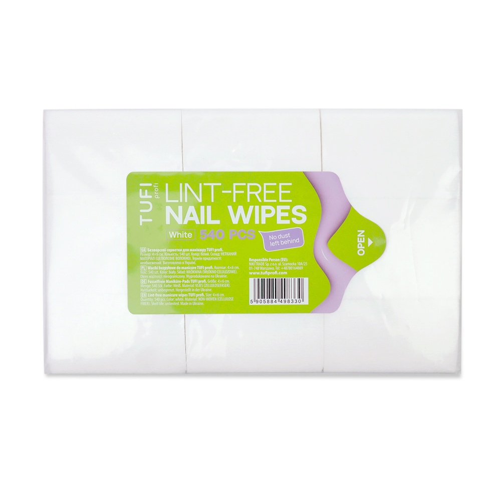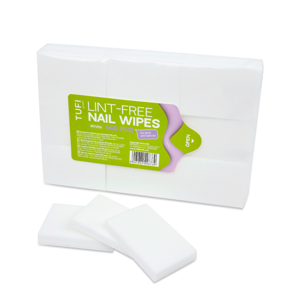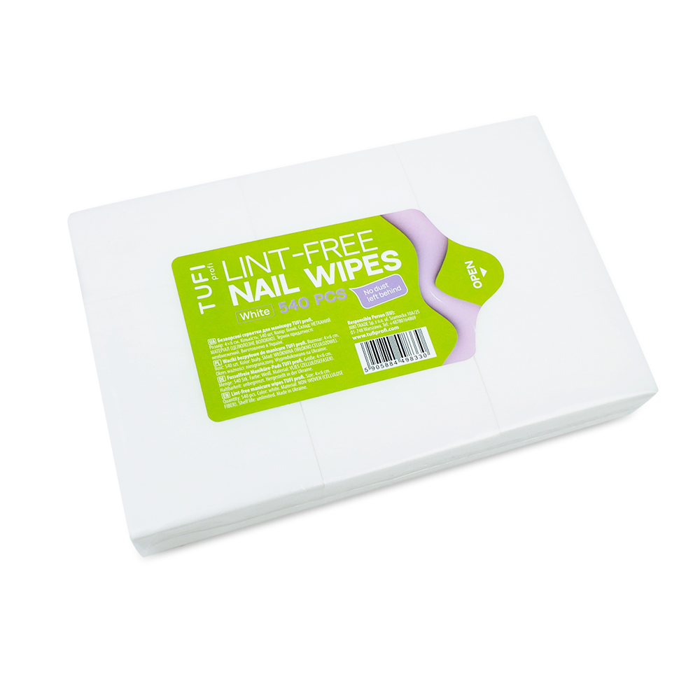 Безворсовые салфетки TUFI profi Белые 4×6 см 540 шт — базовый расходный материал для ежедневной работы мастера маникюра, предназначенный для точной и безопасной подготовки ногтевой пластины. Салфетки изготовлены из плотного качественного материала, который не оставляет ворса, волокон или пыли на поверхности ногтя. Они не расслаиваются и не рвутся во время работы, что особенно важно при обезжиривании, снятии липкого слоя и очищении ногтевой пластины. Материал хорошо впитывает жидкость, не деформируется при контакте с клинсером, дегидратором и другими профессиональными средствами и обеспечивает чистый результат без лишних движений.