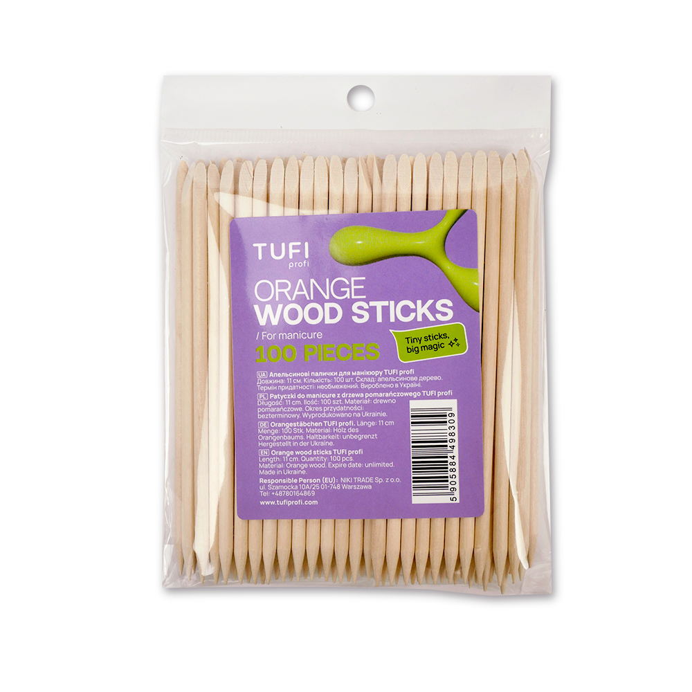 Апельсиновые палочки для маникюра TUFI profi 11 см 100 шт — базовый инструмент для ежедневной работы мастера маникюра. Профессиональный маникюр начинается с деталей, поэтому апельсиновые палочки TUFI profi разработаны с акцентом на качество, безопасность и комфорт в работе. Палочки изготовлены из тщательно отобранной апельсиновой древесины, которая не расслаивается и не крошится во время использования. Благодаря этому инструмент не травмирует кожу и ногтевую пластину, не оставляет микроповреждений и позволяет деликатно работать даже с чувствительной кутикулой. Натуральный материал обладает природными антисептическими свойствами, хорошо впитывает влагу и не деформируется во время работы. Оптимальная степень шлифовки обеспечивает точный контроль движений и предотвращает скольжение.