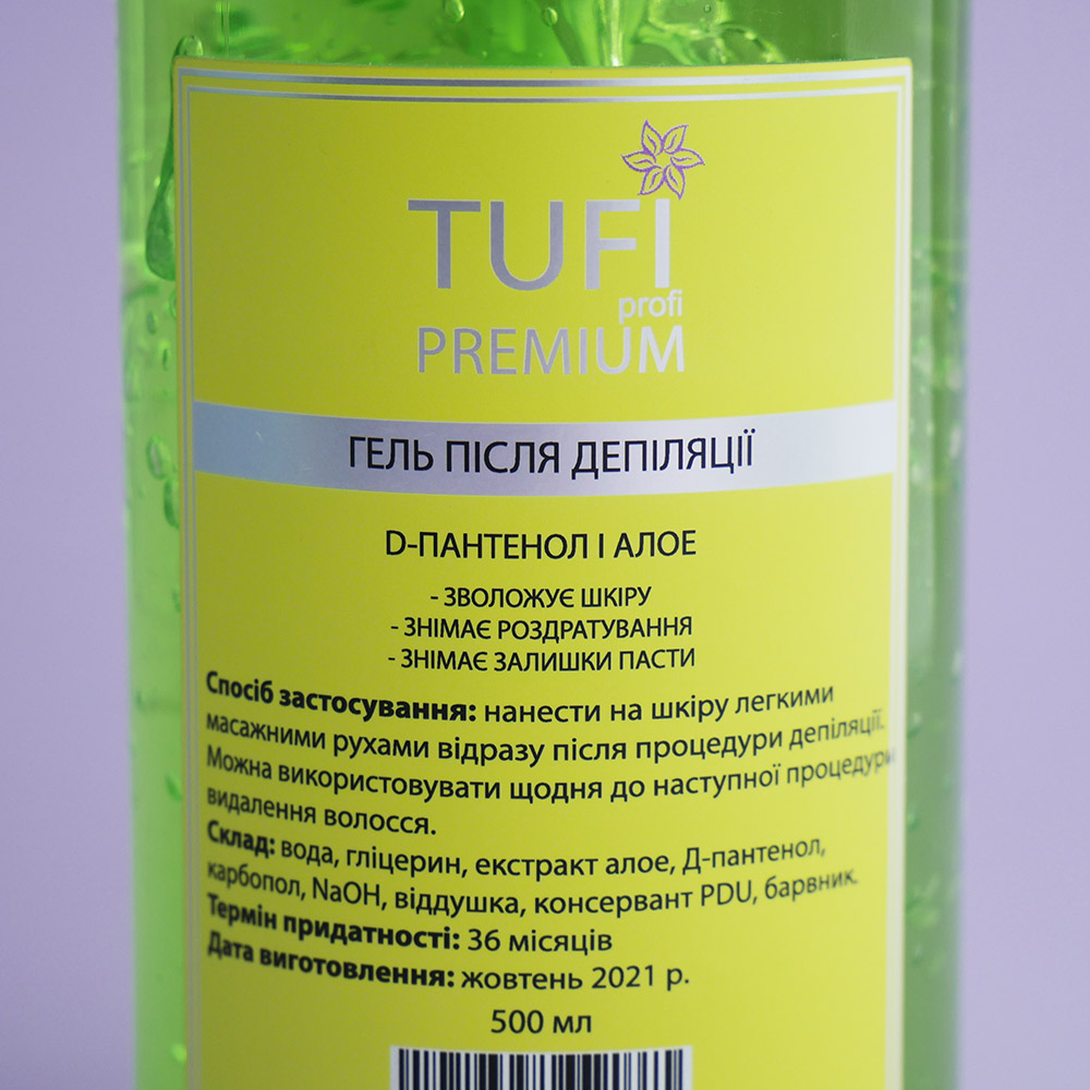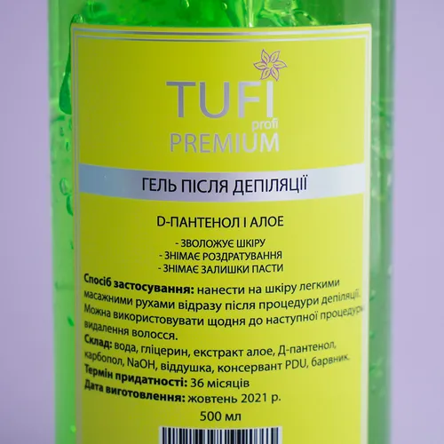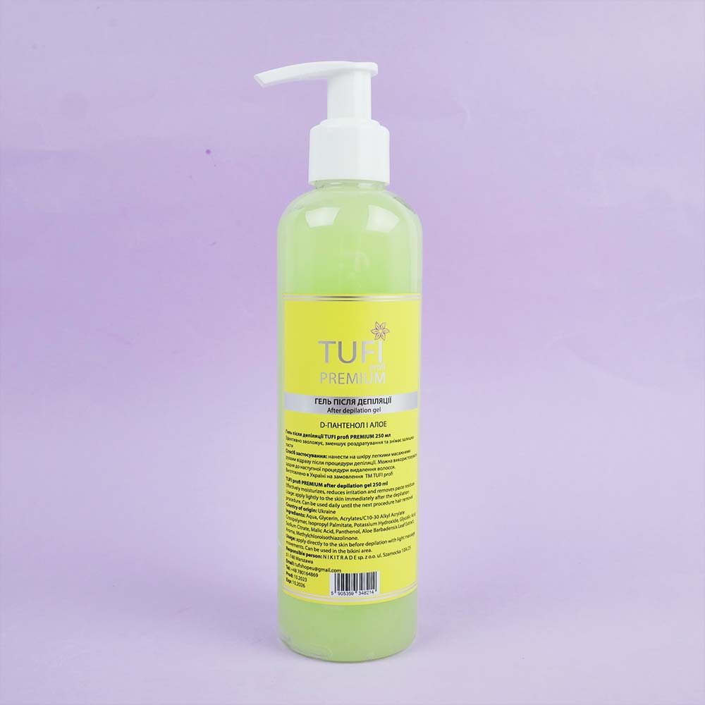 Гель после депиляции TUFI profi PREMIUM Д-пантенол и алоэ 250 мл предназначен для завершающего этапа депиляции. С помощью геля можно избежать раздражения, которые возникает после процедуры депиляции. Благодаря гелю после депиляции TUFI profi PREMIUM происходит заживление, очищение и увлажнение кожи. Также вы можете приобрести различные средства до и после депиляции: гели, лосьоны, тальк, крем, масло. Кроме того, гель имеет удобный дозатор, который поможет комфортно пользоваться средством.